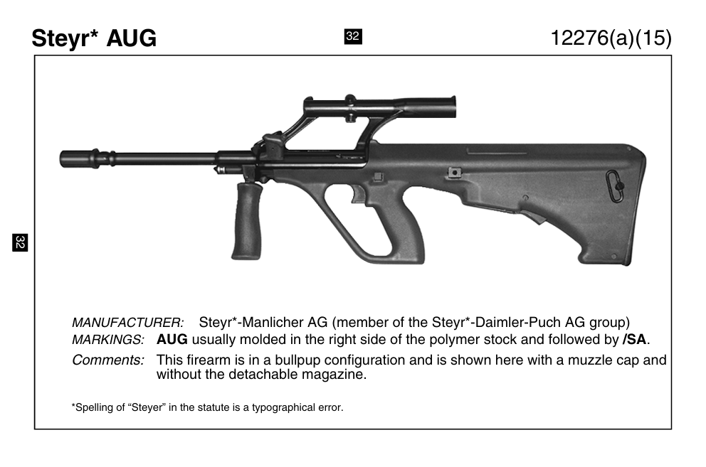 Enacted in response to rising concerns over mass shootings, the AWCA of 1989 banned designated “assault weapons” by explicitly listing them in Penal Code § 30510 (formerly § 12276), aiming to satisfy due process by giving clear notice of prohibited items. However, the statute’s listing of “Steyer AUG”—a misspelling of the actual “Steyr AUG,” a semiautomatic bullpup rifle manufactured by Steyr Arms—created ambiguity. This error, recognized by the DOJ as a “typographical error” in its 2001 “Assault Weapons” Identification Guide, endured from 1989 until AB 3064 amended § 30510 in 2024, effective January 1, 2025. During this 35-year period, owners of authentic Steyr AUGs may have reasonably believed their firearms were unregulated, as they did not match the statutory text.